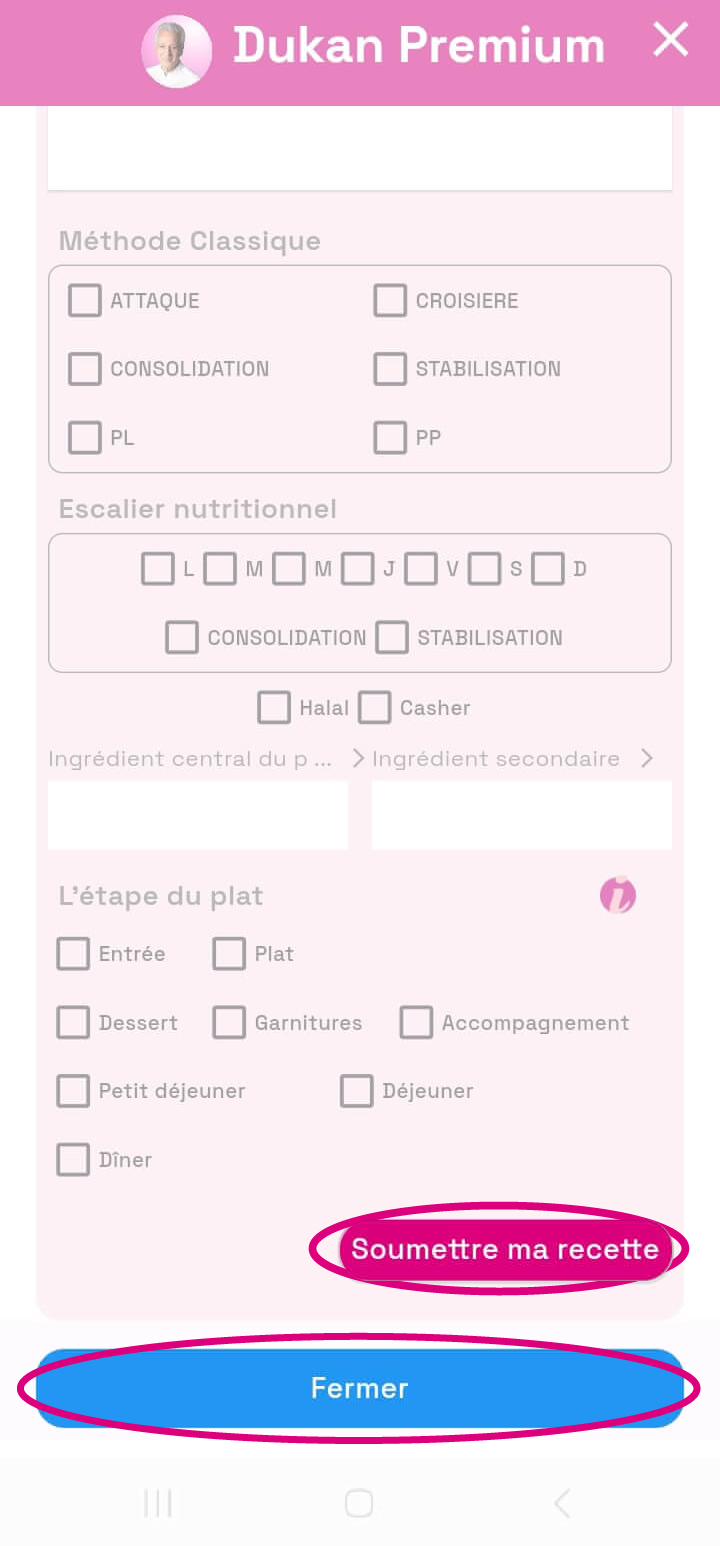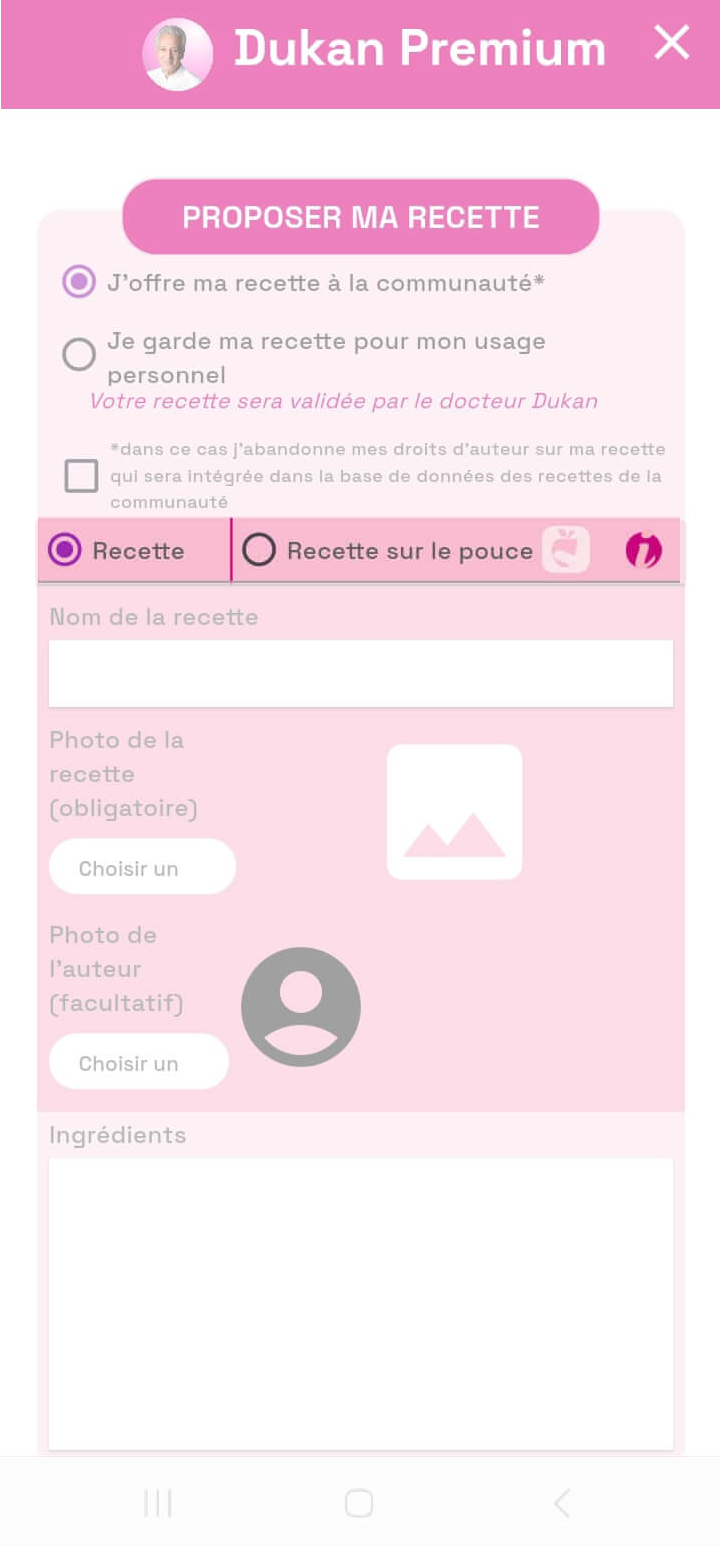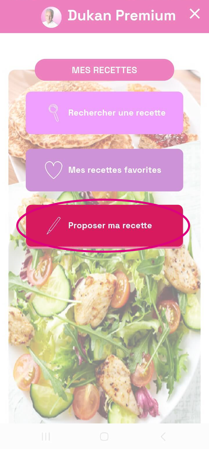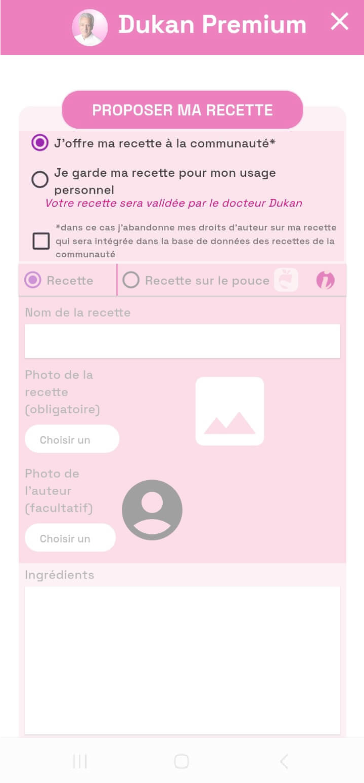 Vous avez l'opportunité de proposer votre propre recette. Elle doit être validée par la Docteur Pierre Dukan pour que vous puissez l'appliquer dans votre programme.