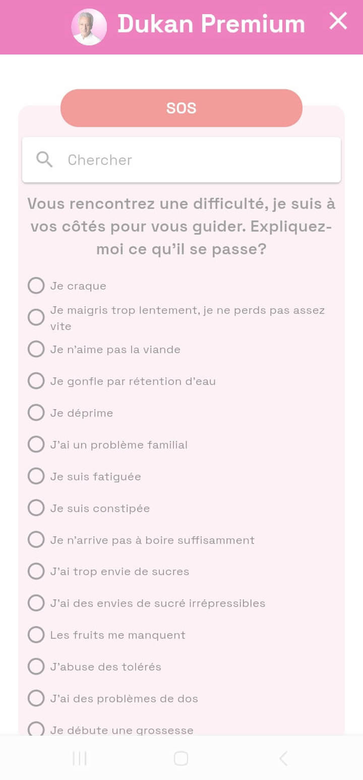 Cette page SOS vous permet de trouver des réponses face à vos difficultés quotidiennes. Cliquez sur une question pour obtenir les conseils du Docteur Pierre Dukan. Pensez à scroller.