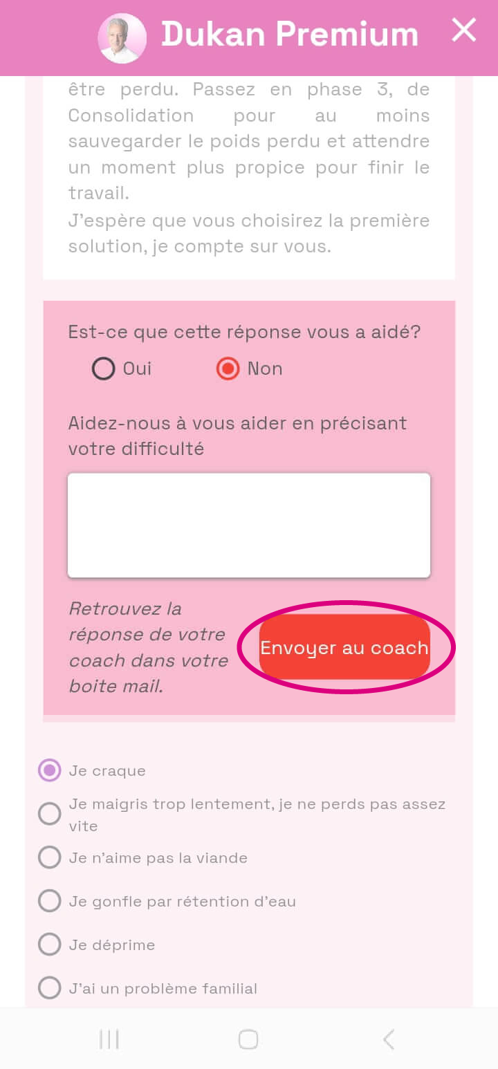 Si l'aide de votre coach ne vous convient pas, le Docteur Pierre Dukan vous répondra directement.