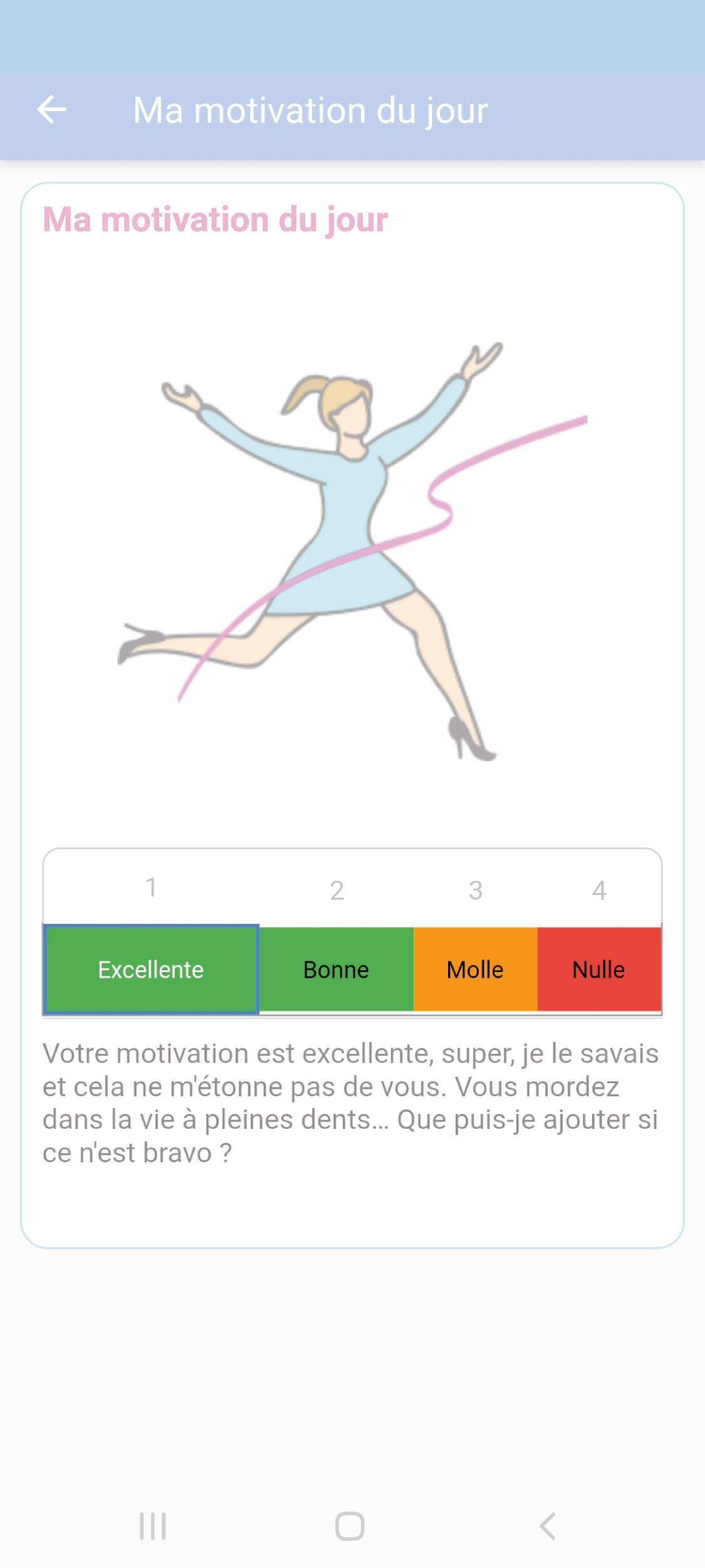 Chaque jour vous devrez indiquer votre motivation du jour. Elle consiste à évaluer votre santé mentale en fonction de votre programme. Il n'y a pas de mauvaise réponse, vous êtes en droit de ne pas vous sentir motivé(e).