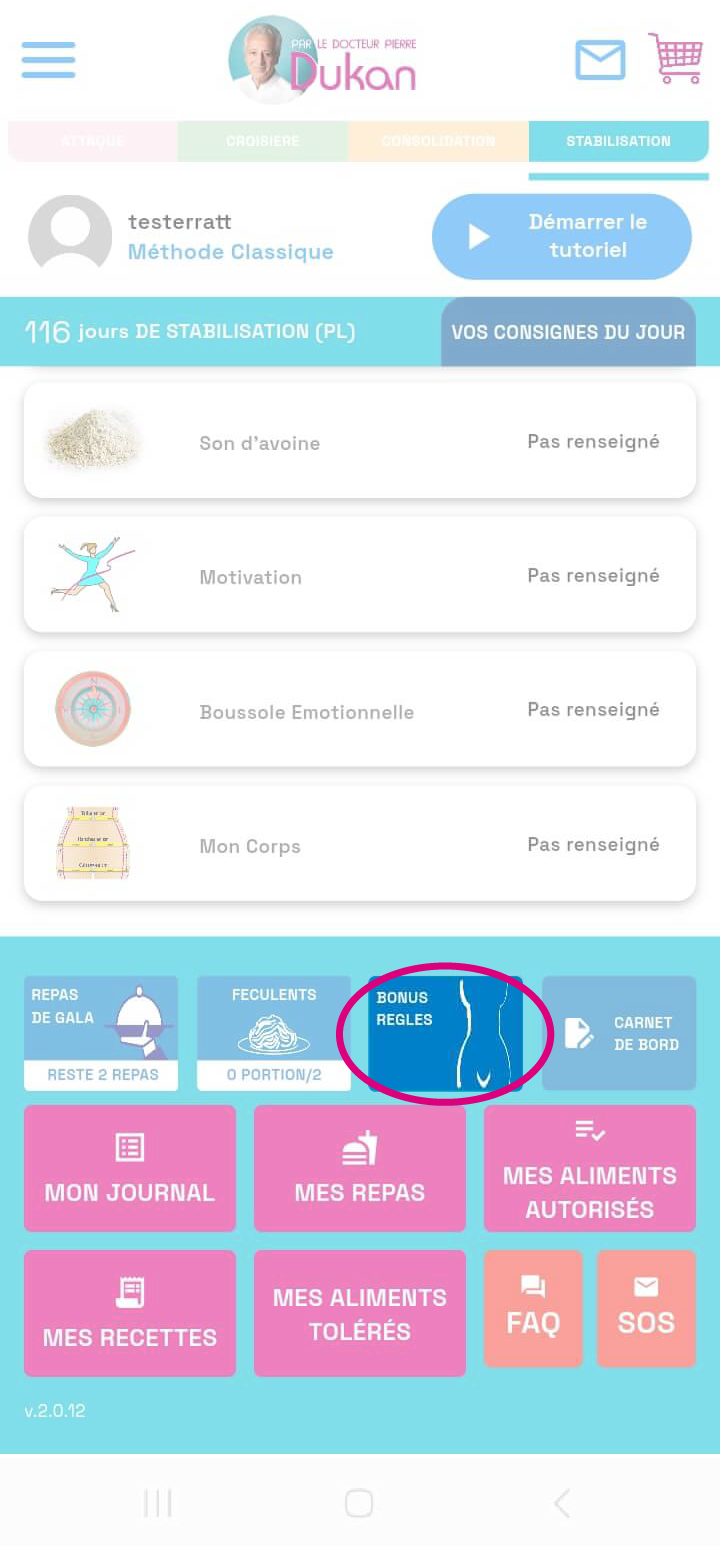 (Pour les femmes) Si vous avez vos règles la semaine prochaine, cliquer sur ce bouton évitera que le bilan de votre régime ne soit pénalisé par la rétention d'eau de la semaine précédant vos règles. Attention ce bouton sera ensuite désactivé pendant une période de 28 jours