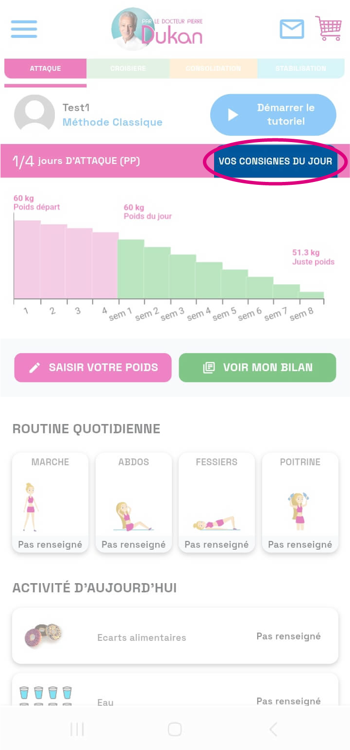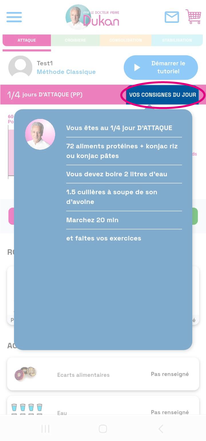 En cliquant sur le bouton Vos consignes du jour, vous ferez apparaître le bloc d'informations pour votre programme. Cliquez à nouveau sur le bouton pour fermer la fenêtre.