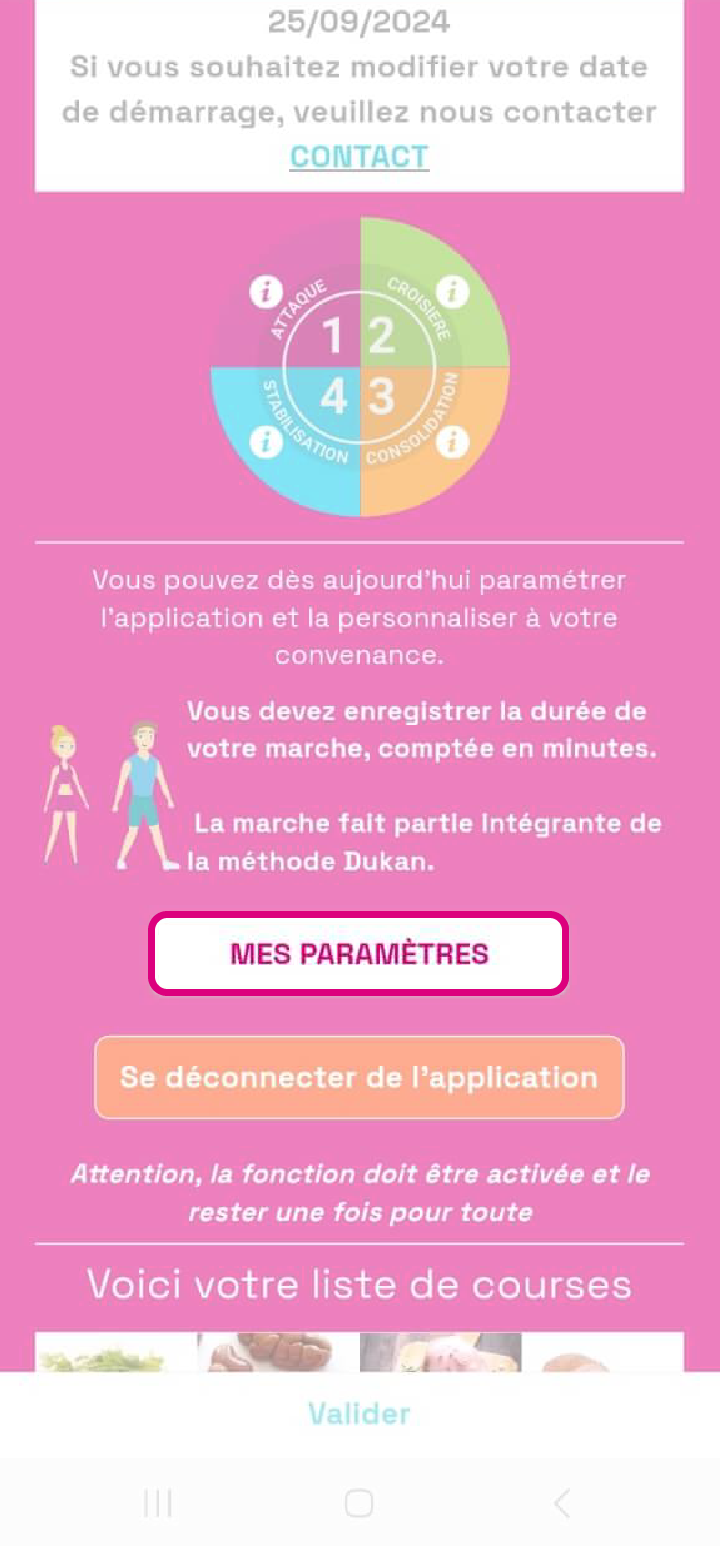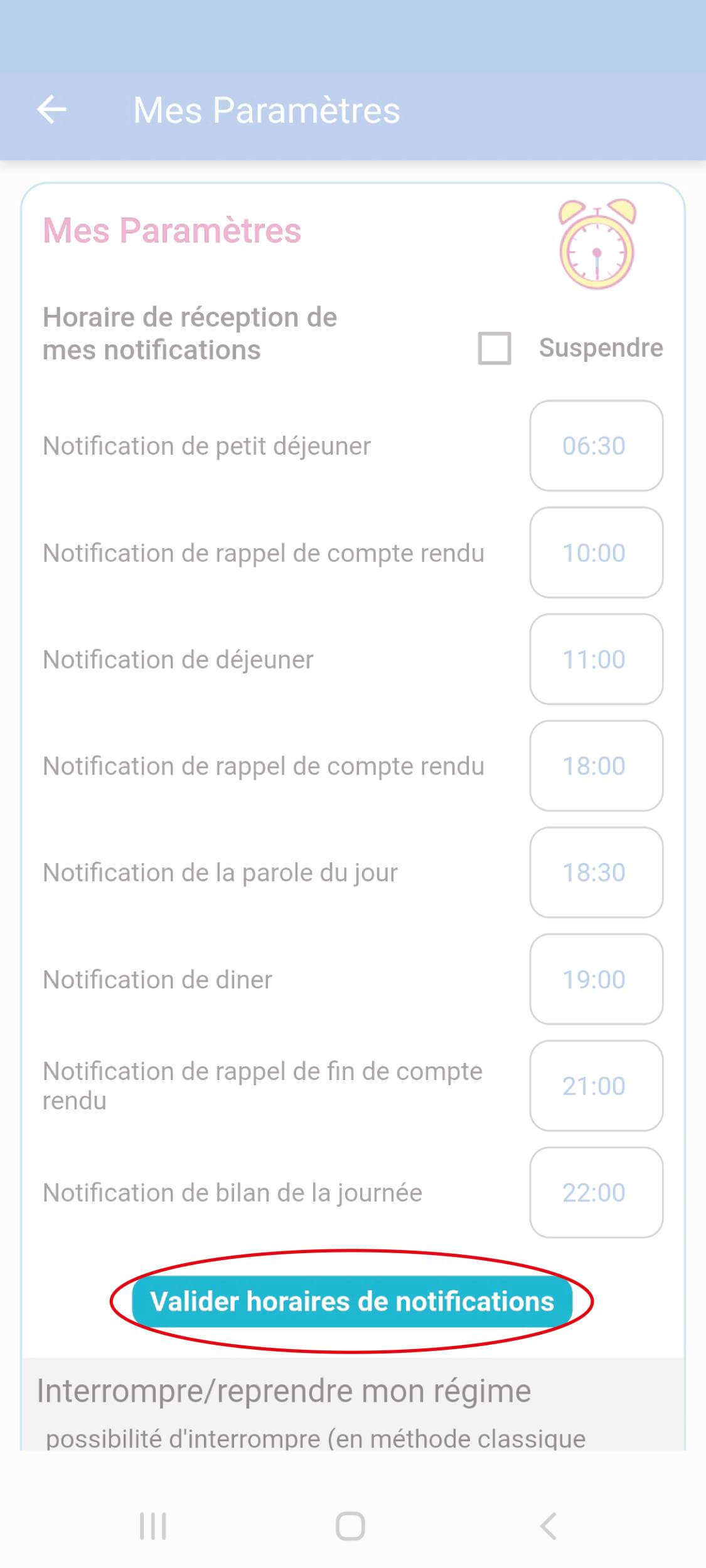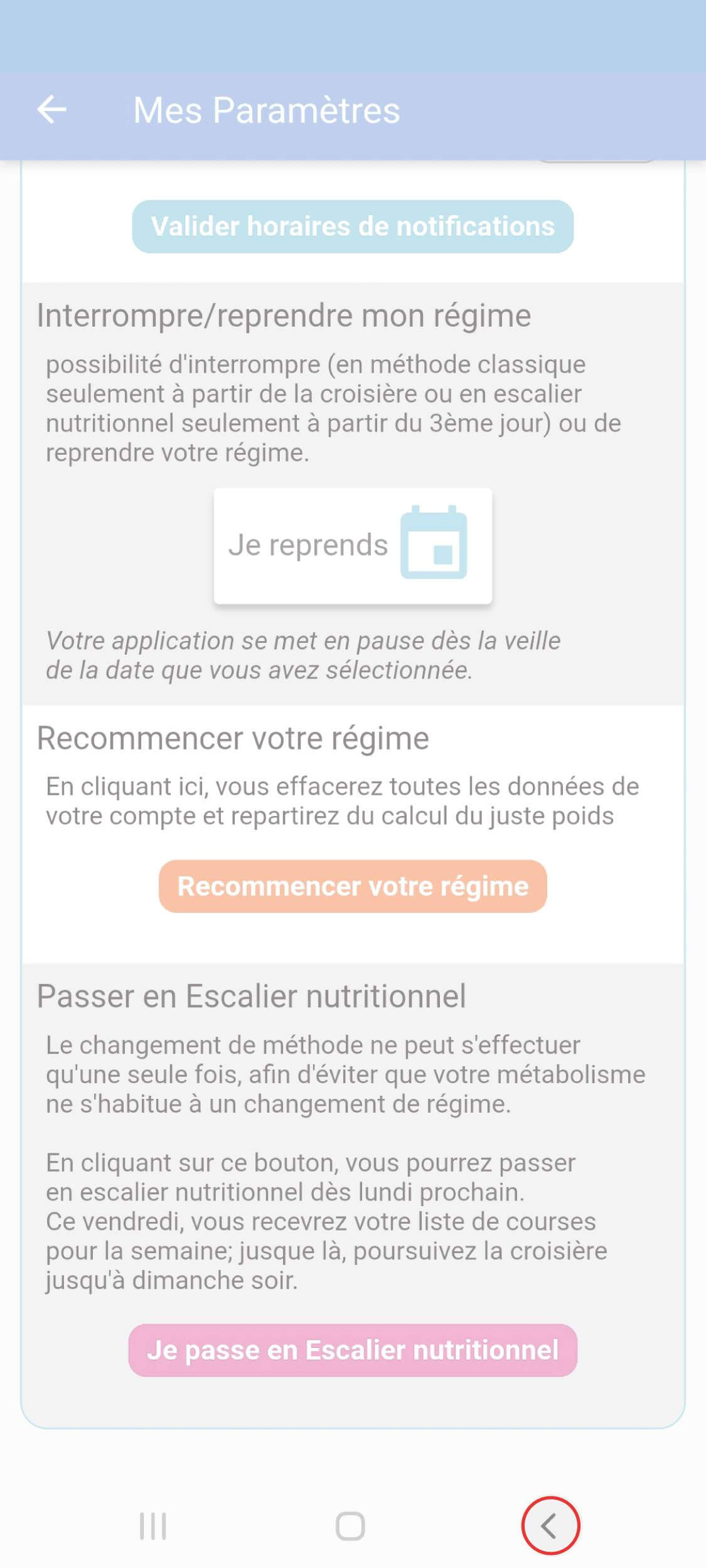 Vos paramètres vous permettent de modificer vos horaires, d'interrompre et de reprendre votre régime, de reprendre à zéro ou de changer de programme.