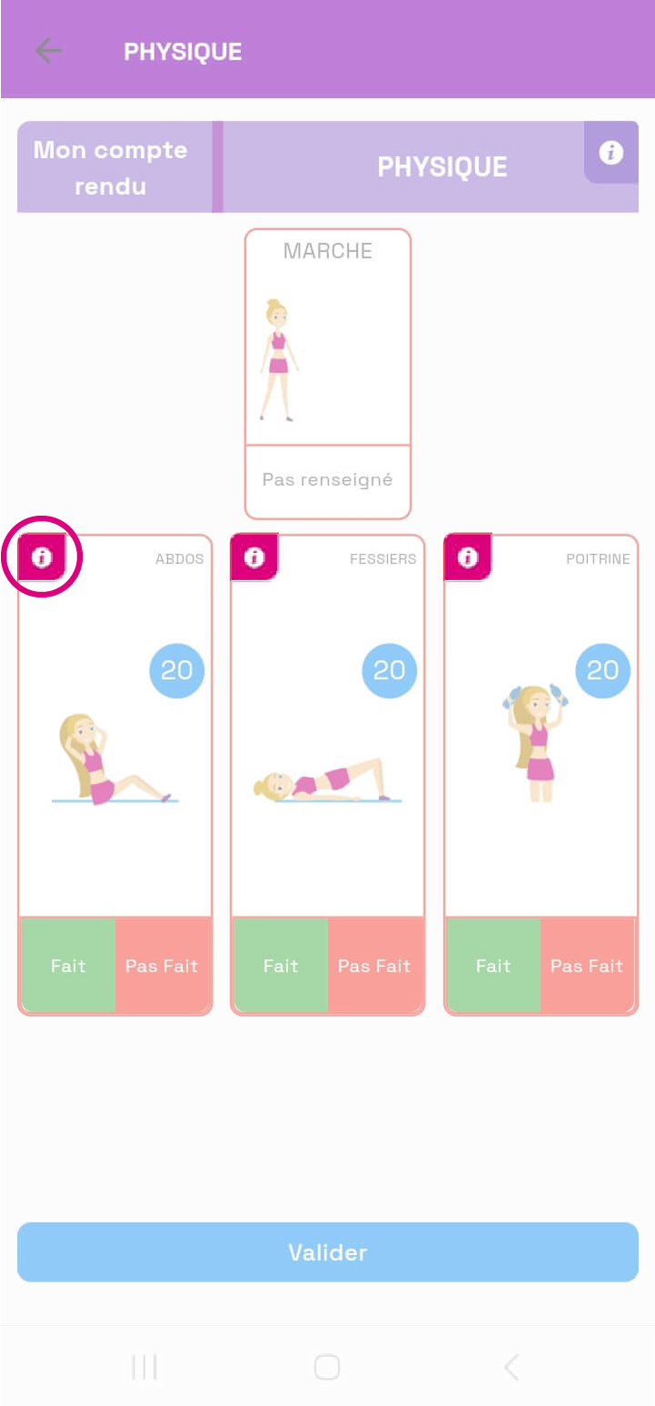 Selon votre programme vous aurez des exercices, cliquez sur le bouton Fait ou Pas Fait pour l'enregistrer dans votre bilan.